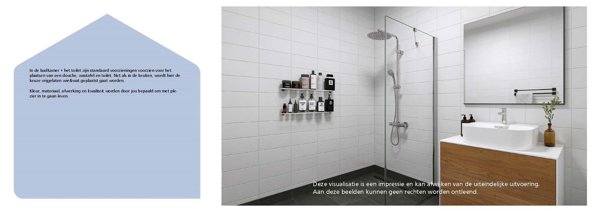 De wanden in de toiletten en badkamers kunnen naar eigen smaak afgewerkt worden.
