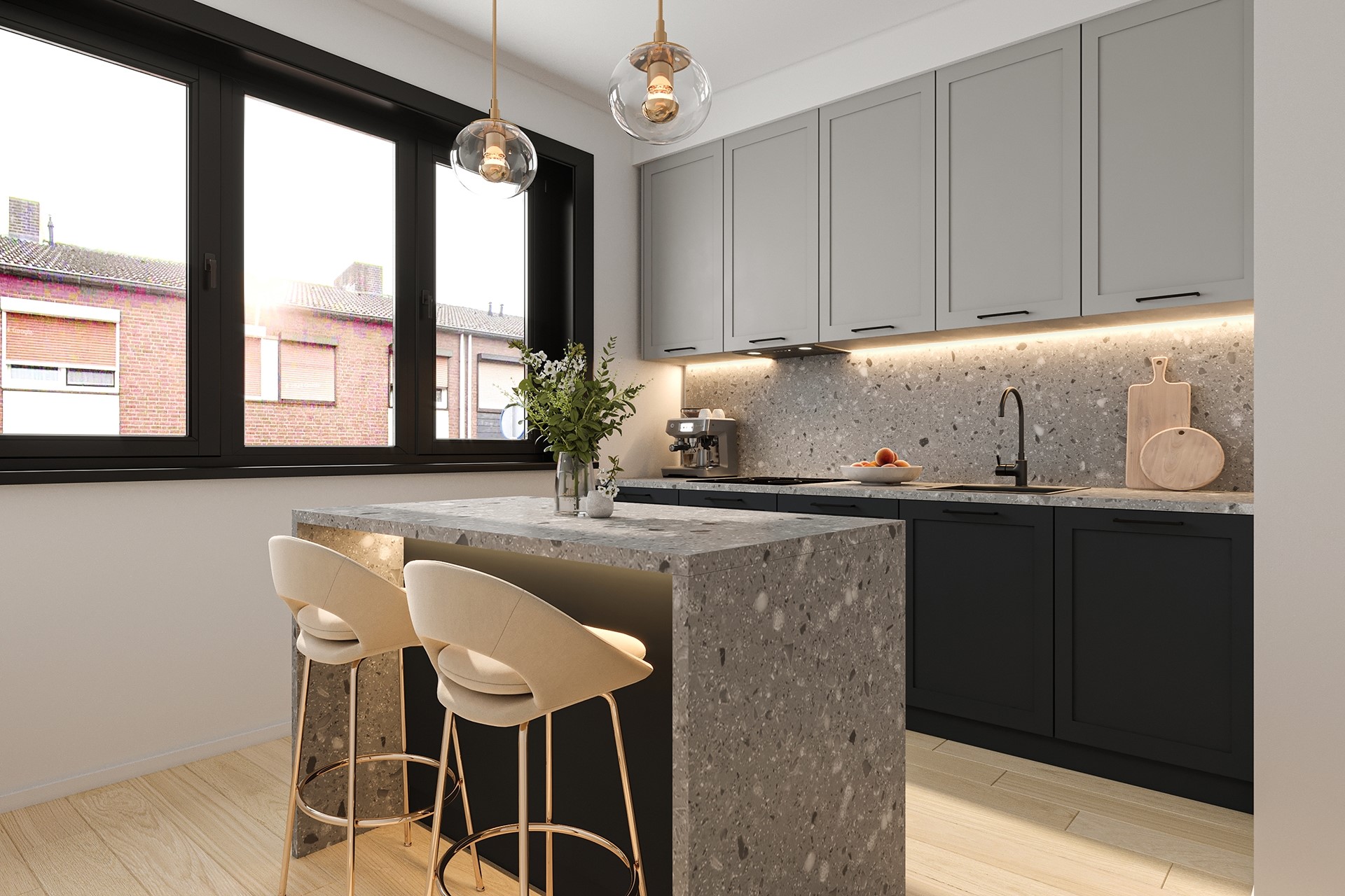 De keukenopstelling kan naar vrije keuze worden ingepland en geplaatst na oplevering